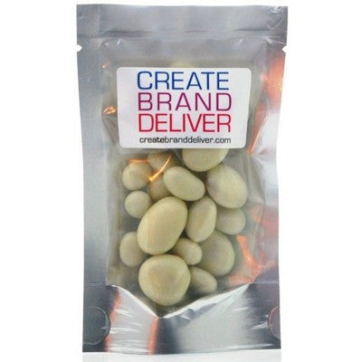 Filled with up to 50g of Sweets Such as Jelly Beans, mints or bonons! Aluminium Silver Metal Laminate Pouch, with a Clear Transparent Front. Low Carbon Footprint. Part of the Eco Friendly Lifestyle Cosmetics & Gifts Range.