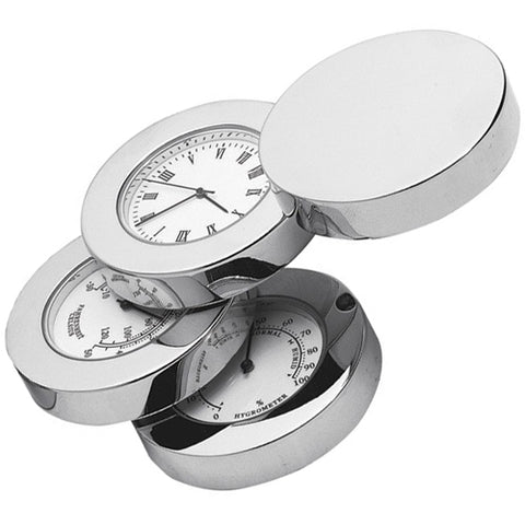 Promotional Weather Stations are a popular gift featuring a clever fold-away design incorporating a clock, thermometer and hygrometer. Tri Alloy plated. These stylish weather devices come in a shiny silver colour with a neat dial design. Personalise by engraving your company's name or message for a permanent finish. These highly useful branded weather system device will make a spectacular executive business gift that will be greatly appreciated by all those special clients whilst flaunting your brand.