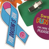 Promotional Shaped foam badges printed full colour with a wide selection of shapes to choose from. These printed foam badges can also be cut to a shape of your choice and design from 90 x 60mm foam (price on application). A choice of pin badge or crocodile clip fittings are available for the same price. Please state your preference upon ordering. Great for all promotions, a good low cost item. Shapes available: Droplet 62 x 64.5mm, Speech Bubble 73.5 x 50mm, Bottle 37 x 88mm, Foot 49 x 90mm, Awareness Ribbon 40.5 x 80.5mm, Small Van 89 x 42mm, Heart 58 x 55mm, T-shirt 63.5 x 60.5mm, Keyhole 50 x 86mm, Drink Can 34.5 x 68.5mm, Triangle 61 x 55mm, Hard Hat 57.5 x 52mm, No 1 36 x 69mm, Teddy Bear 50 x 70mm, Star 73.5 x 70mm, Bungalow 89.5 x 57.5mm, House 57.5 x 67.5mm, Telephone 82.5 x 53mm, Computer 64.5 x 55.5mm, Recycle bin/skip 90 x 50mm, Credit Card 85 x 63mm, Wheelie Bin 65.5 x 84mm, Connect Van 94.5 x 44.5mm, Tooth 47.5 x 63mm/55 x 73.5mm, Transit Van 80.5 x 55.5mm, Cloud 68.5 x 48mm. Rectangles: 90x40mm, 70x50mm, 85 x 63mm. Squares: 60mm, 40mm. Circles: 65mm, 60mm, 55mm. Oval: 78x50mm, 50x68mm. Also available as Magnets, Pencil Toppers or Keyrings. Please contact us for further information and/or prices.